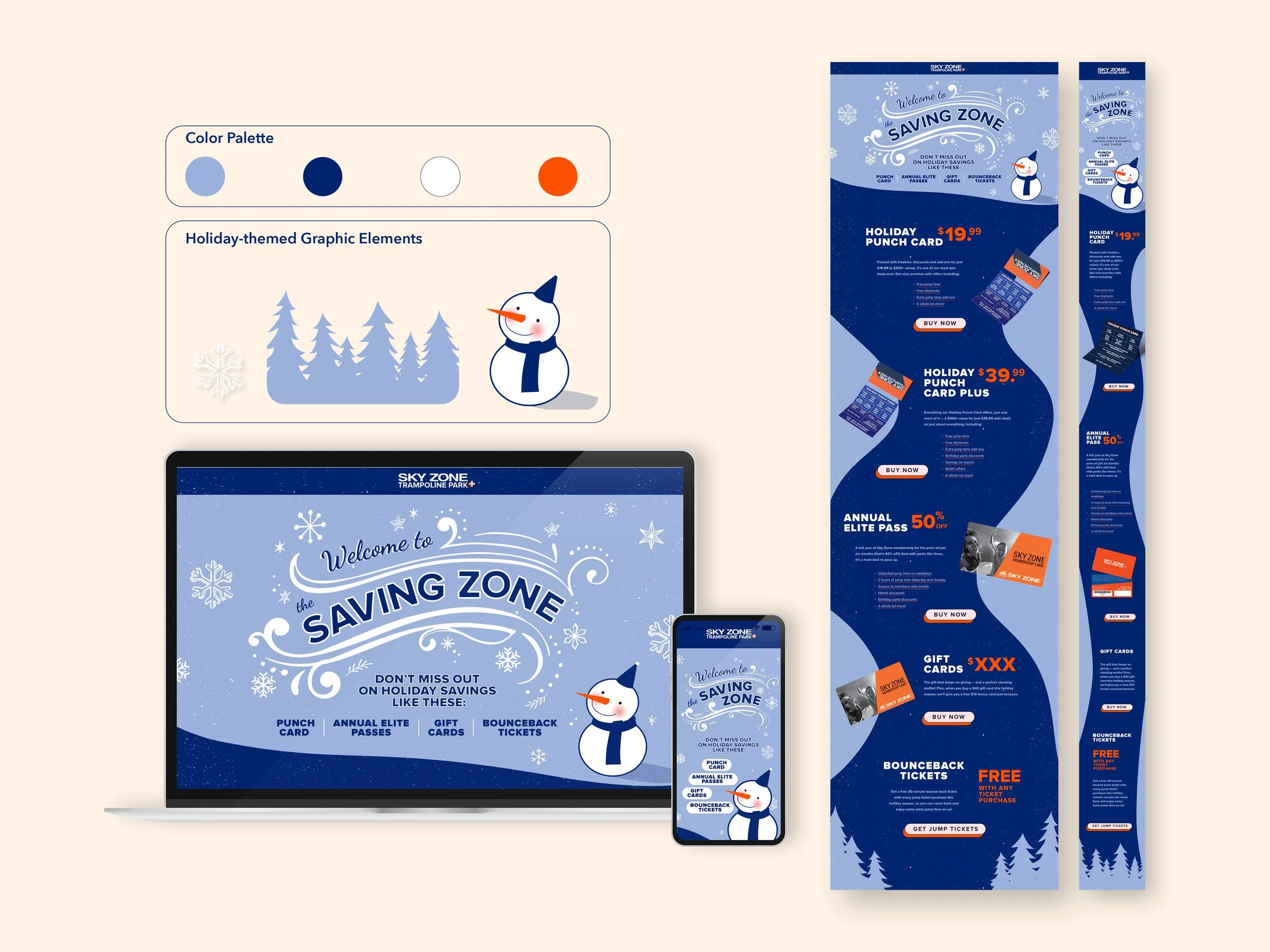 This Holiday Campaign was created for Sky Zone, a trampoline park and entertainment venue in the US. The campaign encompassed various design elements such as desktop and mobile landing pages, punch card sets, membership cards, ads of different sizes and formats (digital and print), email attachments, menus, flyers, and more.